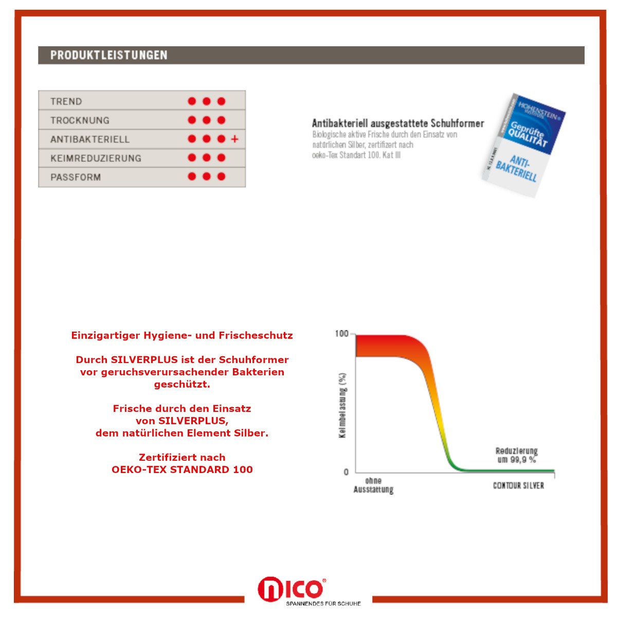 Die Schuhformer sind antibakteriell und abwaschbar, verhindern Gehfalten und erhalten die Schuhform, besonders bei weichem Oberleder oder Textilmaterial. Der Viskoseflock sorgt für sehr gute Aufnahme von Feuchtigkeit.